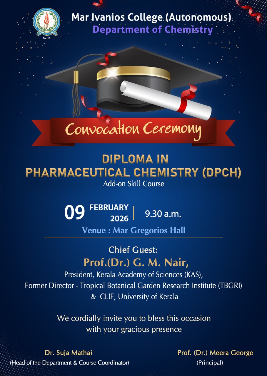 Mar Ivanios College was established in 1949 and pursues excellence upholding the far-sighted vision of our revered Founder, Servant of God Archbishop Mar Ivanios. The College is the first Institution in the University of Kerala to receive accreditation from the National Assessment and Accreditation Council (NAAC) in 1999. The College was also the first to be re-assessed and re-accredited with ‘A’ Grade by NAAC in 2004. In 2011 the College was re-assessed by the NAAC Peer team as part of the Third Cycle of re-accreditation process. Mar Ivanios College became the first private college affiliated to the University of Kerala to receive the status of CPE from the UGC. Upon the recommendations of the University Grants Commission (UGC). The College has been conferred with Autonomy status by the University of Kerala with effect from 13th June 2014.